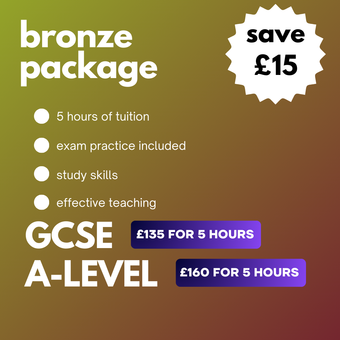 SAVE WITH OUR PACKAGE DEALS ⋆ SAVE WITH OUR PACKAGE DEALS ⋆ SAVE WITH OUR PACKAGE DEALS ⋆ Store Bronze Package from £135.00 Select Course A-Level GCSE Add To Cart Added! Silver package from £265.00 Select course A-level GCSE Add To Cart Added! Gold Package from £500.00 Select course A-level GCSE Add To Cart Added!